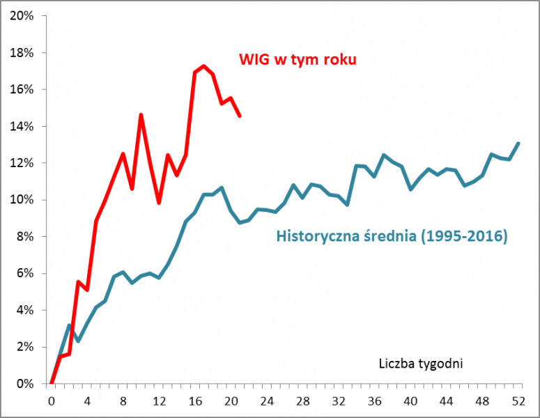- tegoroczna zwyżka okazała się jak na razie "ponadnormatywna" (w ciągu mniej, niż pięciu miesięcy WIG wypracował lepszą stopę zwrotu, niż średnio przez cały rok wg historycznego "wzorca");