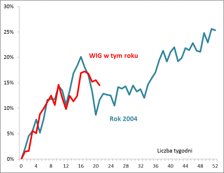Oczywiście od tej historycznej średniej zdarzały się nawet bardzo znaczne odchylenia. Idźmy krok dalej i spróbujmy znaleźć te lata, które na GPW były najbardziej podobne do bieżącego. Naszym zdaniem był to rok ... 2004 (rok wejścia Polski do UE).