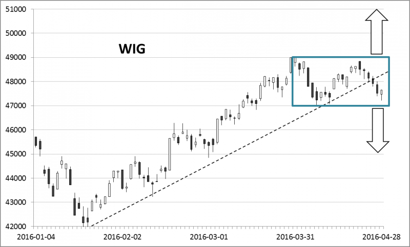 Na wykresie widać wyraźną formację konsolidacji w przedziale 47-49 tys. pkt. Gdyby doszło do wybicia w którymś kierunku, mogłoby to według książkowych schematów zapowiadać ruch o mniej więcej 2 tys. pkt. (szerokość konsolidacji), czyli albo do 45 tys. pkt. w scenariuszu negatywnym, albo do 51 tys. w wariancie optymistycznym. Czyli na dwoje babka wróżyła... Póki co pułap 47 tys. pkt. można traktować jako ważny poziom wsparcia, przy którym pojawi się szansa na obronę. Teoretycznie ze względu na punkt cyklu, w którym jesteśmy, korekta nie powinna wyrządzić wielkich szkód, ale z tego rodzaju krótkoterminowymi prognozami różnie bywa.