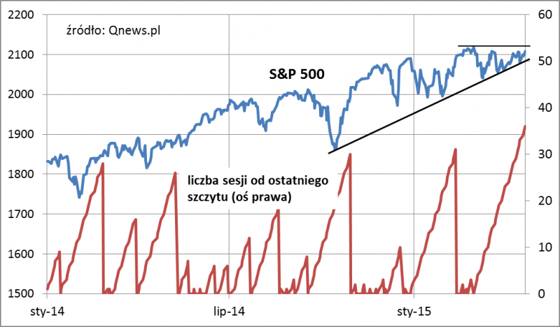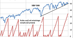 W środę minęło 36 sesji od ostatniego rekordu amerykańskiego S&P 500. Z naszych obliczeń wynika, że czas oczekiwania na nowy szczyt hossy jest już dłuższy niż w trakcie wszystkich korekt z ostatnich dwóch lat. Poprzednim razem dłużej na rekord trzeba było czekać jeszcze na przełomie lat 2012/2013 – wówczas były to aż 74 sesje, czyli ponad dwa razy więcej niż obecnie.