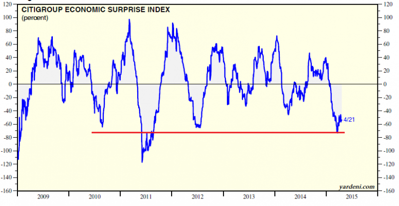 Jak powszechnie zwraca się uwagę, ostatniej słabości na Wall Street towarzyszyła seria rozczarowujących danych makro. Tymczasem obrazujący to zjawisko, obliczany przez Citigroup indeks niespodzianek ekonomicznych jest już na poziomach, przy których ustanawiał dołki w połowie lat 2010 i 2012. Wyraźnie niżej zszedł tylko w trakcie kulminacji obaw przed nawrotem recesji w 2011 r. Skoro zatem skala rozczarowań jest już tak znaczna, to teraz paradoksalnie otwiera się przestrzeń do odczytów danych lepszych od obniżających się oczekiwań rynkowych. Czyli nie ma tego złego, co by później nie wyszło na dobre.