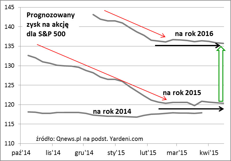 I jeszcze jedna sprawa. O ile od października ub.r. do lutego br. trwała fala obniżek prognoz zysków spółek (przyczyny: umocnienie dolara, kłopoty sektora naftowego), to ostatnio ten negatywny trend został wyhamowany. Prognozy zarówno na ten rok, jak i przyszły są już w miarę stabilne. O ile w tym roku zarobki firm z S&P 500 mają urosnąć symbolicznie (2 proc. względem 2014 r.), to już w przyszłym wzrost ma wynieść ponad 12 proc. (względem 2015 r.). Taka perspektywa będzie zachęcająca dla inwestorów, szczególnie gdyby uatrakcyjniły się wyceny (wskaźniki cena/zysk).