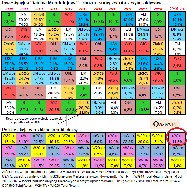 Nasze coroczne zestawienia stóp zwrotu z poszczególnych klas aktywów wielokrotnie przynosiły trafne - choć nierzadko kontrowersyjne - wnioski na kolejny rok. Przypomnijmy, że rok 2018 był bardzo słaby dla tzw. ryzykownych aktywów i udany dla tzw. defensywnych (dolar i obligacje). Przypomnijmy konkluzje płynące z naszego zestawienia za 2018: