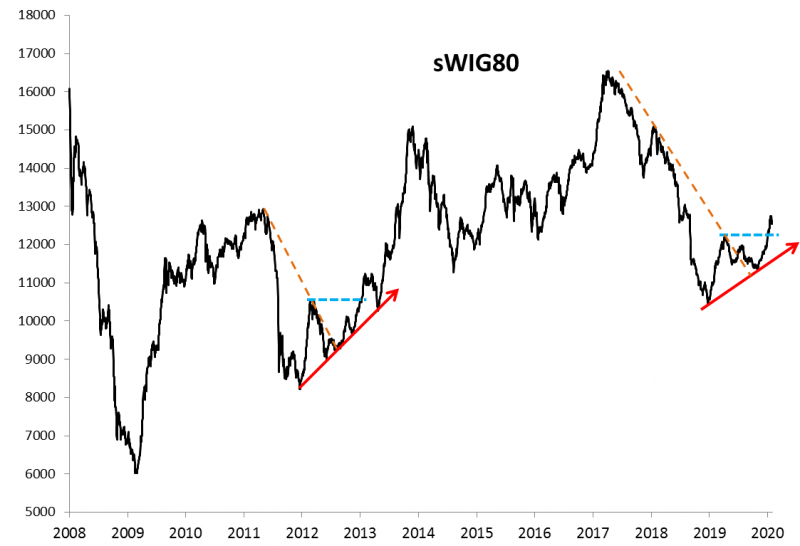 Z dołka ostatniej wyprzedaży (XII 2018) sWIG80 w pierwszym etapie odbił się nieco ponad 15 proc. w górę (do kwietnia 2019). Ten ruch był analogiczny do pierwszego odreagowania na początku 2012 roku. W kolejnym etapie nadeszła faza „rozczarowania” i powolnego oddawania zysków z pierwszej fali odbicia – trwała do października ub.r. i również miała swój odpowiednik w 2012 roku. Od tego czasu trwa druga fala zwyżkowa, w wyniku której sWIG80 pokonał górkę ustanowioną w trakcie pierwszej fali i znalazł się najwyżej od kilkunastu miesięcy.