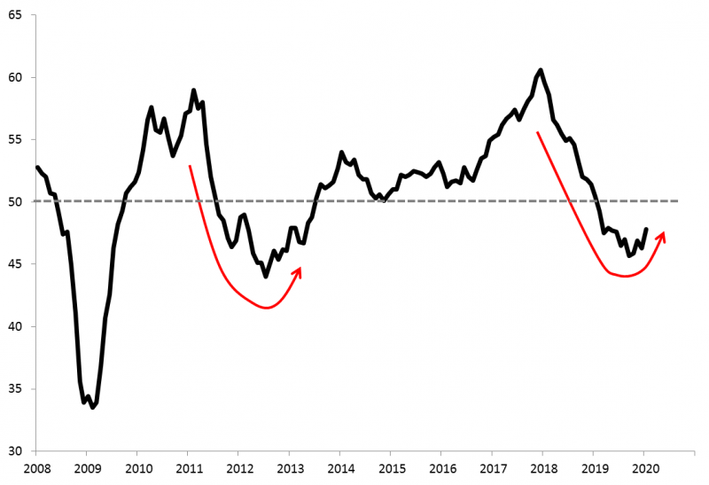 Rok 2019 był jednym z dwóch epizodów po roku 2009, w którym PMI w strefie euro spadł głęboko poniżej granicy 50 pkt. (oddzielającej teoretycznie ekspansję od recesji w przemyśle). Drugim takim epizodem był rok … 2012. Mamy zatem kolejny ważny element omawianej analogii.