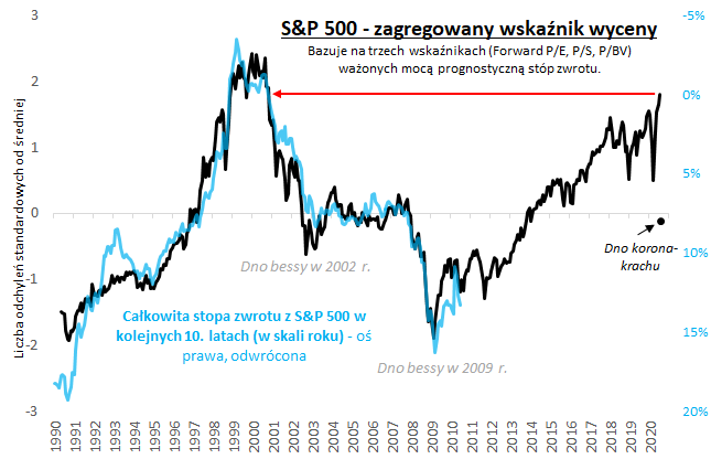 Jak widać ten stan rzeczy implikuje mniej więcej zerową całkowitą stopę zwrotu z S&P 500 w horyzoncie 10-letnim.