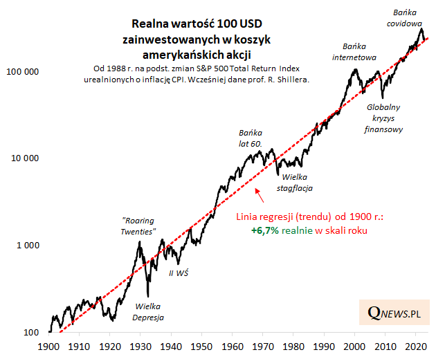 Pierwszy wniosek - bardzo optymistyczny na długą metę - jest taki, że posiadanie koszyka amerykańskich akcji dawało 6,7 proc. realnego zysku średnio w skali roku. Podkreślmy, że chodzi o stopę zwrotu, która (a) uwzględnia dywidendy i ich reinwestycję, (b) jest już pomniejszona o inflację.