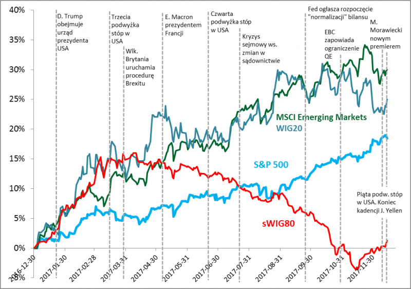 Po dość burzliwym 2016 roku (referendum ws. Brexit, wygrana D. Trumpa, a u nas m.in. spekulacje na temat nacjonalizacji OFE) u progu 2017 roku powszechnie oczekiwano kolejnych turbulencji na rynkach finansowych, być może jeszcze silniejszych. Rzeczywistość okazała się zupełnie odmienna. Kwestie polityczne, które były tak akcentowane w poprzednim roku, stopniowo odeszły w zapomnienie, szczególnie po przegranej wyborczej populistów we Francji i Holandii. W USA inwestorzy skupili się wyłącznie na pozytywnych aspektach polityki Trumpa, podczas gdy jeszcze na jesieni 2016 obawiano się jego protekcjonistycznych haseł. Stopniowy upadek tzw. Państwa Islamskiego jeszcze bardziej uspokoił rynki. Spokoju nie zburzyła nawet coraz bardziej prężąca muskuły Korea Północna.