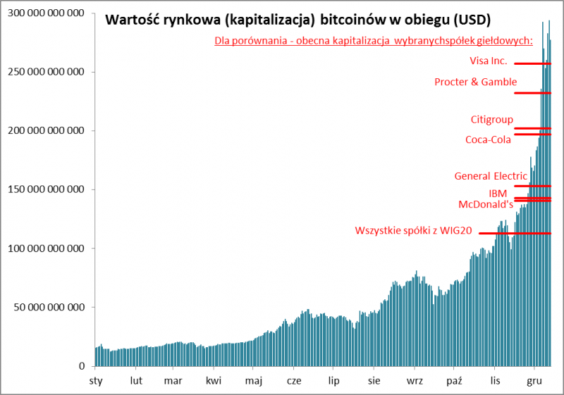 O kryptowalutach, takich jak bitcoin było głośno już od pewnego czasu, ale chyba mało kto spodziewał się, jakie rozmiary osiągnie moda na to aktywo. Pierwotnie według zamysłu twórców kryptowaluty miały być alternatywą dla oficjalnych „papierowych” walut emitowanych dowolnie przez banki centralne. Miały stanowić bezpieczny środek płatności. Tymczasem w praktyce stały się czymś zupełnie innym – przedmiotem gorączki spekulacyjnej. Mocno ograniczona podaż bitcoinów w sytuacji coraz większego popytu sprawiła, że ich cena wystrzeliła. O ile jeszcze na początku roku łączna wartość bitcoinów w „obiegu” wynosiła ok. 15 miliardów dolarów (co i tak było niebagatelną kwotą), to ostatnio urosła do kosmicznych rozmiarów. Ponad 250 mld dolarów kapitalizacji (wg Coinmarketcap.com) to kwota większa od wartości większości amerykańskich korporacji. Większą ma tylko garstka największych gigantów z Wall Street. Bitcoiny stały się warte tyle, ile połowa imperium finansowego Warrena Buffetta, budowanego od … pół wieku.