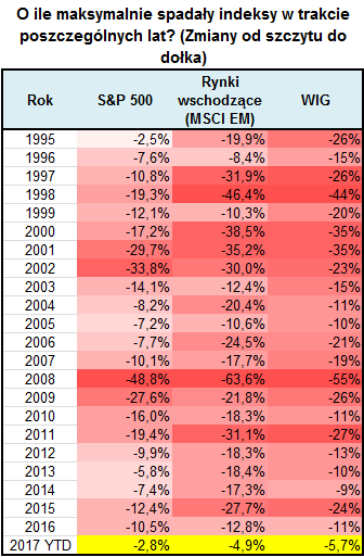 Giełdowa sielanka udzieliła się nawet znanym jako dużo bardziej ryzykowne rynkom wschodzącym. Co prawda od końcówki listopada rozgrywa się tu najsilniejsza w tym roku korekta spadkowa, ale i tak spadek od szczytu rzędu 5 proc. wygląda wręcz symbolicznie na tle historii. Od 1996 roku nie zdarzyło się, by korekta w trakcie roku była jednocyfrowa.