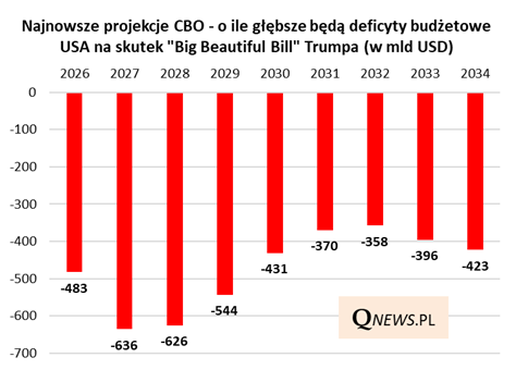 Po pierwsze analizy CBO potwierdzają tylko wcześniejsze przypuszczenia ekonomistów - "piękna, wielka ustawa podatkowa" (BBB) Trumpa ma przynieść dalsze pogłębienie deficytów budżetowych, nawet przy uwzględnieniu prognoz nieco szybszego wzrostu PKB na skutek niższych podatków.