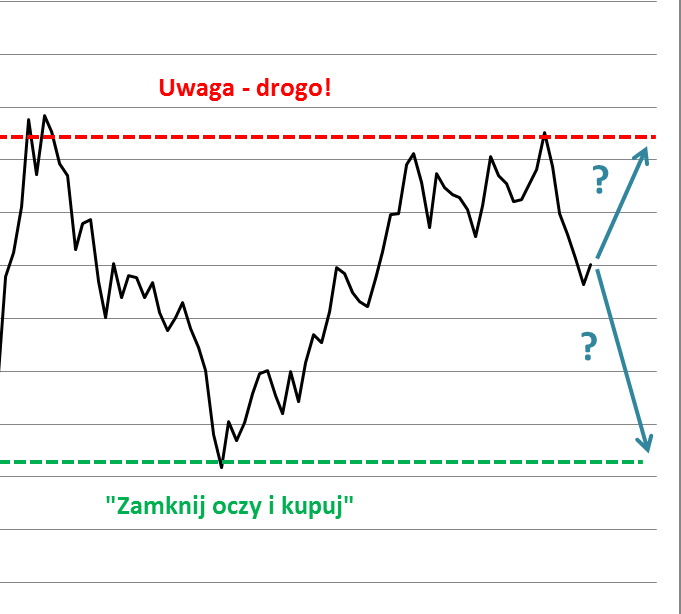 Oczywiście scenariusz hossy nie jest jedynym możliwym przy obecnym, umiarkowanym poziomie wycen, więc zatankowanie akcjami portfela „pod korek” nie jest być może najbardziej logiczną taktyką. Skoro istnieje wariant (mało prawdopodobny, ale jednak możliwy) zejścia P/E do jeszcze dużo niższych poziomów w razie jakiejś kolejnej fali kryzysu ekonomicznego na świecie, to bardziej logiczne jest zbudowanie na razie tylko częściowej pozycji na rynku akcji (bo scenariusz hossy stał się bardziej prawdopodobny na skutek korekty) i jednoczesne pozostawienie miejsca w portfelu na ewentualne jeszcze tańsze zakupy.