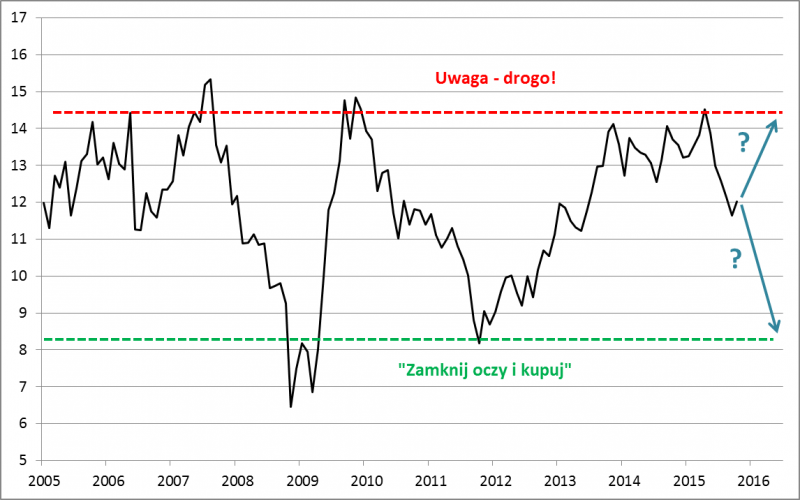Jak mogłoby to wyglądać w praktyce? Przykładowo, przy obecnym poziomie P/E część akcyjna portfela mogłaby być wypełniona w połowie. Po spadku P/E o każdy kolejny punkt można by wypełniać tę część o kolejne 10 proc. W ten sposób w hipotetycznym, ekstremalnym scenariuszu spadku P/E poniżej 7 (to wartość z dołka kryzysu finansowego z przełomu lat 2008/2009) część akcyjna byłaby już w całości wypełniona skrajnie tanimi (i przez to atrakcyjnymi na dłuższą metę) akcjami. Oczywiście mówiąc o części akcyjnej nie mamy na myśli całego portfela inwestycyjnego, lecz tylko tę jego część, która w oparciu o indywidualną tolerancję dla ryzyka może być przez danego inwestora z „czystym sumieniem” ulokowana w akcje (jeśli inwestor ma dość silną awersję do ryzyka, to część akcyjna mogłaby stanowić np. tylko 20 proc. portfela, co oznaczałoby, że omówiony wcześniej schemat zakupów wystartowałby obecnie od 10 proc. portfela). Rzecz jasna ten przykład nie jest jedynie słusznym sposobem postępowania, ale wydaje się, że stanowi pewne lekarstwo na rynkową niepewność, przy zachowaniu szans na zyski z akcji w przypadku realizacji pozytywnego scenariusza.