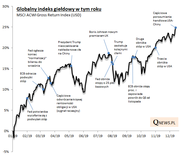 Dodajmy do tego jeszcze fakt, że po drugiej stronie oceanu Europejski Bank Centralny ogłosił powrót do QE, mimo że jeszcze w grudniu ub.r. jego szef Mario Draghi zapewniał, że to świetny moment do … zakończenia QE. Bez wątpienia odchodzący rok zapisze się na kartach historii jako ten, w którym banki centralne dokonały zwrotu w polityce monetarnej o 180 stopni. Co oczywiście nie pozostało bez wpływu na rynki. Ten wpływ powinien utrzymywać się przynajmniej w pierwszej połowie 2020, choć nieco zmieni się percepcja rynkowa – o ile na przestrzeni tego roku dyskontowano poluzowanie polityki, to w przyszłym inwestorzy będą wypatrywali ewentualnych sygnałów ewentualnego wycofywania się z tego luzowania.