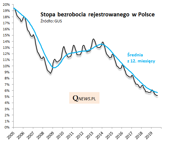 Na razie wg bardziej szczegółowych danych miesięcznych trudno byłoby zakładać, że ten trend się już zmienia (dane za wrzesień poznamy 23 X, ale nie oczekuje się tu większej zmiany). Stopa bezrobocia jest w okolicach dołka, a 12-miesięczna średnia maleje (choć już nie tak szybko jak wcześniej).