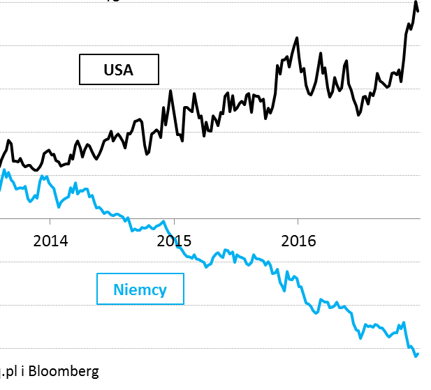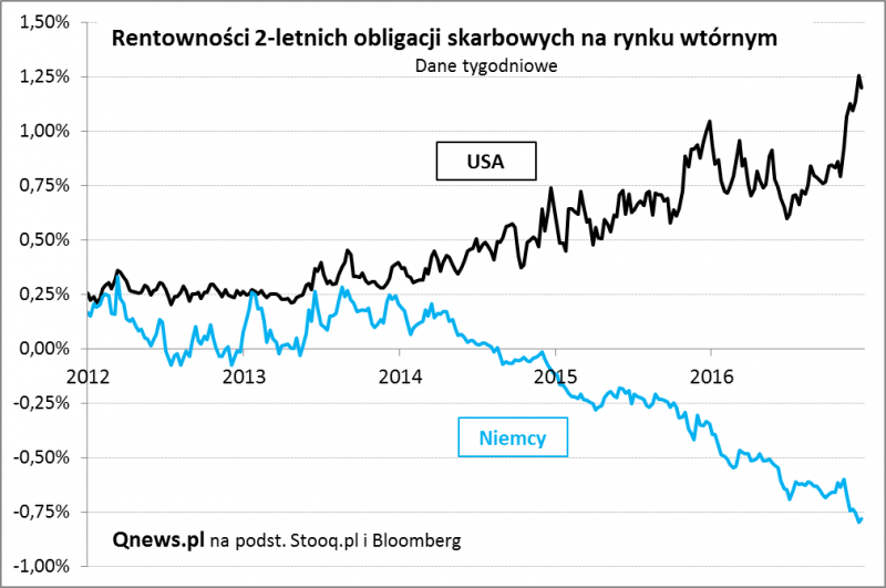 Kończący się rok pozostawia po sobie fenomen, który niegdyś byłby wręcz niewyobrażalny, a obecnie jest na porządku dziennym i nikogo już nie dziwi. Jeszcze nigdy nie mieliśmy do czynienia z tak rozbieżnymi trendami na dwóch należących do najważniejszych rynkach obligacji: amerykańskim i niemieckim (lub też ogólnie rynku strefy euro). Podczas gdy rentowność krótkoterminowych obligacji USA poszybowała w górę, rentowność ich niemieckich odpowiedników staje się coraz bardziej i bardziej ujemna.