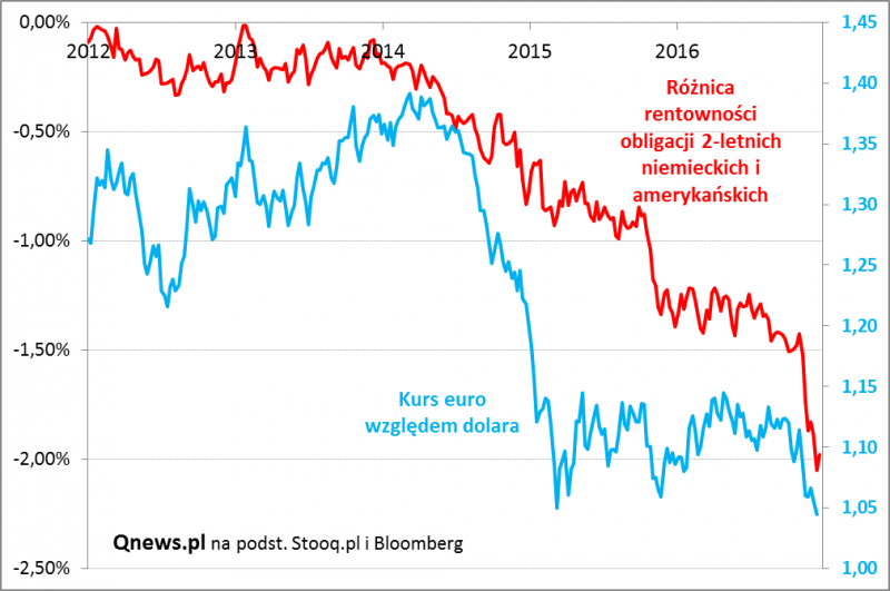 Oczywiście źródło tej dywergencji (rozbieżności) jest dobrze znane - jest nim równie rozbieżna polityka banków centralnych. O ile amerykańska Rezerwa Federalna po raz drugi podniosła właśnie stopy procentowe, to EBC uparcie kontynuuje skup obligacji (QE), windując ich ceny i tym samym spychając rentowności w dół. Powiększająca się różnica (spread), jeśli chodzi o rentowności, wywiera z kolei wyraźną presję na osłabienie euro względem dolara.