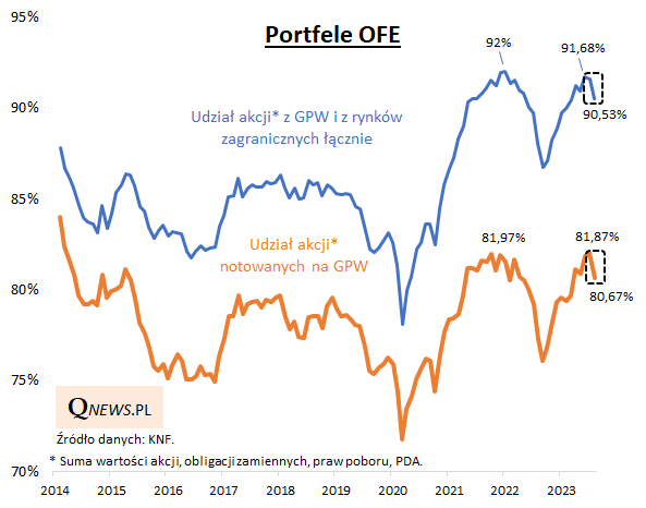 Po pierwsze, z opublikowanych właśnie danych na temat struktury portfeli OFE (otwartych funduszy emerytalnych) wynika, że udział akcji, który wcześniej rósł niemal z miesiąca na miesiąc, w sierpniu wyraźnie spadł. Spadek o 1,15 pkt proc. od szczytu w przypadku akcji ogółem i o 1,2 pp w przypadku akcji notowanych na GPW, jest zdecydowanie największy w tym roku i zarazem najgłębszy od jesieni ub.r.