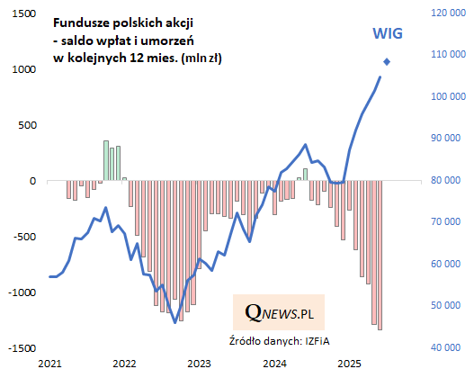 Wręcz przeciwnie! Co prawda danych za lipiec jeszcze oczywiście nie mamy, ale dane IZFiA do czerwca pokazują, że w kolejnych 12-miesiącach saldo wpłat i umorzeń w funduszach polskich akcji wyniosło ... -1,34 mld zł. To oznacza, że odpływy stały się większe niż nawet w okolicach wspomnianego dołka na jesieni 2022!
