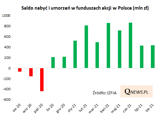 Sierpień był już dziesiątym miesiącem nieprzerwanych napływów netto do szeroko pojętych funduszy akcji w Polsce, choć tempo (+434 mln zł) było słabsze niż w najlepszym w tym roku czerwcu (+865 mln zł) - wynika z naszych obliczeń na podstawie danych Izby Zarządzających Funduszami i Aktywami (IZFiA).