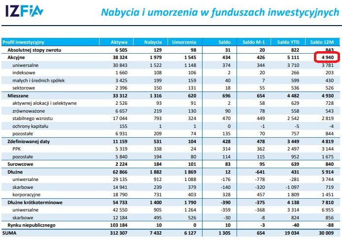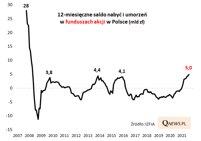 12-miesięczna krocząca suma napływów netto, którą użyć można do porównywania historycznych trendów, jest już o krok od 5 miliardów złotych.
