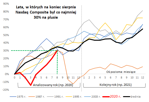 Czy fakt, że po ośmiu miesiącach roku gromadzący gwiazdy obecnej hossy indeks Nasdaq Composite jest 30% na plusie, kryje w sobie jakieś przesłanie na przyszłość? Zerknijmy kiedy inwestorzy mieli do czynienia z taką sytuacją. Okazuje się, że do tej pory miała ona miejsce pięć razy w historii indeksu sięgającej 1971 roku.