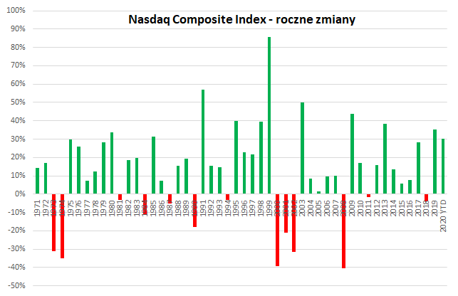Z tą analizą jest jednak pewien problem. Pamiętajmy bowiem, że już w ubiegłym roku Nasdaq zyskał ponad 30%. Warto też zauważyć, że tak silna zwyżka w dwóch kolejnych latach zdarzyła się dotąd tylko jeden raz - w kulminacyjnej fazie bańki internetowej, w latach 1999-2000 (ale wzrost w samym 2000 roku przekroczył astronomiczne 80%!).