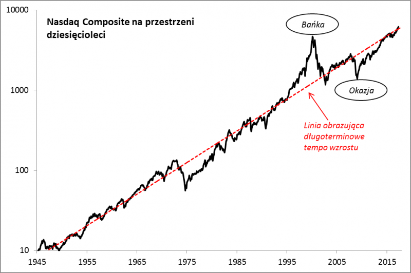 Widać, że spektakularną skalę zwyżki od 2009 należy umieścić w szerszym kontekście. Otóż w dołku w 2009 Nasdaq startował z bardzo okazyjnych poziomów, mocno odbiegających w dół od długoterminowego tempa wzrostu. A teraz? Indeks jest nieznacznie powyżej linii tego wzrostu (to potwierdza, że korekta jest możliwa), ale o czymś takim jak w trakcie bańki z końca XX wieku nie sposób mówić. To nie jest słynna "nieracjonalna wybujałość" (irrational exuberance - termin ukuty niegdyś przez znanego z kwiecistej retoryki Alana Greenspana).