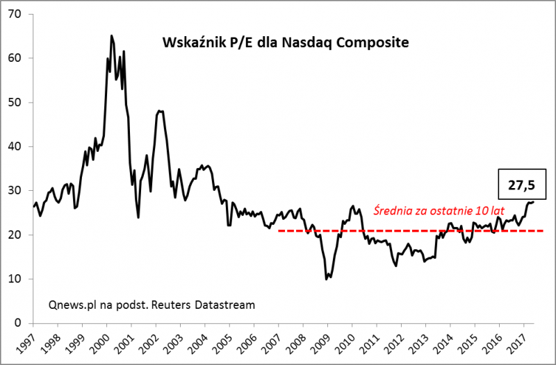 Wraz z szeroko komentowanym zaatakowaniem przez kurs Amazon.com - jednego z gigantów Wall Street - poziomu 1000 USD rozgorzała na nowo debata na temat tego czy spółki technologiczne nie są zbyt drogie. Niektórzy porównują nawet obecną sytuację do pamiętnej bańki internetowej, która pękła w 2000 roku. Wskazują, że od dołka z 2009 indeks Nasdaq Composite urósł o prawie ... 350% (!). Tylko w tym roku zdążył on podskoczyć o prawie 20%, bijąc na głowę nawet szerszy indeks S&P500.