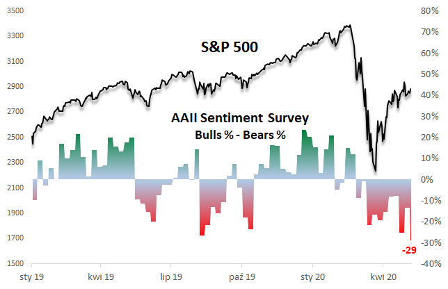 W okolicach marcowego dołka większość wskaźników zeszła do poziomów świadczących o silnym strachu na rynkach. A jak to wygląda obecnie? Naszą uwagę zwróciły w tym tygodniu silne rozbieżności między dwoma wybranymi miarami sentymentu na Wall Street.
