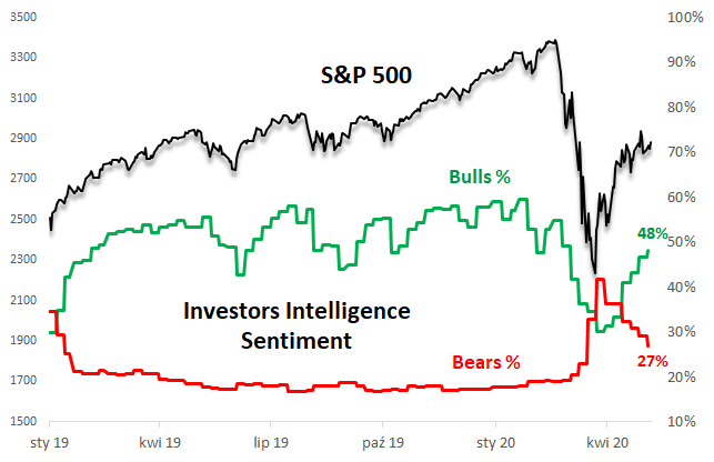 Jeden z najbardziej poważanych wskaźników - tworzony od dekad przez Investors Intelligence raport na temat zapatrywań autorów tzw. newsletterów inwestycyjnych - pokazuje stopniowe ocieplanie nastrojów. Czyli wzrost odsetka pozytywnie nastawionych doradców oraz spadek negatywnie wyrokujących. Ten trend trwa już od sześciu tygodni, czyli od momentu, gdy pesymiści zdecydowanie przeważali liczebnie nad optymistami (i to - nie po raz pierwszy w historii - był świetny moment do zakupów).
