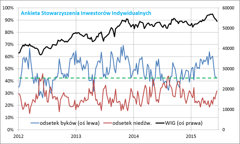 Co prawda obecny poziom wskaźników jeszcze nie gwarantuje końca korekty spadkowej (w skrajnych przypadkach optymistów było mniej niż pesymistów - to były najlepsze okazje do kupowania akcji), ale zauważmy, że przy tych poziomach kończyły się przynajmniej niektóre z historycznych korekt (IX 2013, VI 2013, XI 2012).
