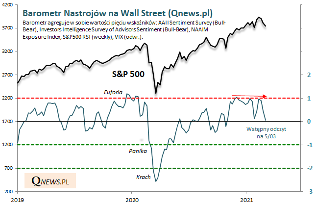 Czy w świetle tych sygnałów nadmiernej spekulacji postępująca korekta zdołała już wystarczająco schłodzić nastroje? W przypadku wielu z opisanych wskaźników/sondaży będziemy się o tym mogli przekonać dopiero na przestrzeni marca. Póki co na bieżąco dysponujemy np. naszym barometrem nastrojów. Według wstępnego odczytu (ostateczny podamy w poniedziałek) wskaźnik sentymentu na Wall Street znalazł się o krok od poziomu neutralnego i zarazem najniżej od listopada ub.r.