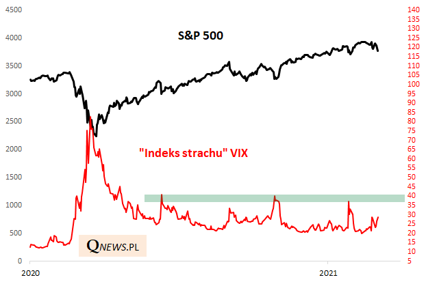 W poszukiwaniu oznak schłodzenia warto spoglądać też na będący jednym z komponentów naszego barometru "indeks strachu" VIX. W okresie po "korona-krachu" korekty spadkowe na Wall Street kończyły się, gdy VIX osiągał strefę ok. 37-40 pkt. (inną kwestią jest to, że wtedy nie mieliśmy do czynienia z takimi oznakami spekulacyjnego przesytu jakie wymieniliśmy powyżej...).