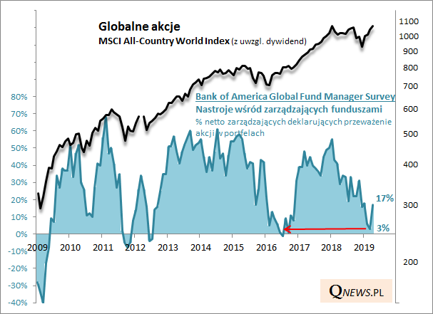 Miesiąc temu pisaliśmy, że nasz ulubiony barometr wyłowiony z sondażu BAML spadł wtedy do poziomu najniższego od połowy 2016, co świadczyło o zupełnym braku wiary w kontynuację trendu wzrostowego. Teraz jednak zarządzający zaczynają coraz cieplej spoglądać na rynki akcji. Odsetek netto menedżerów deklarujących przeważenie akcji w portfelach podskoczył nagle z 3% do 17%.