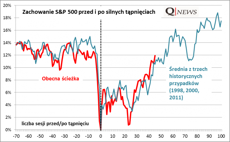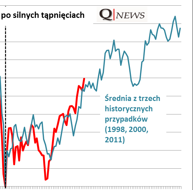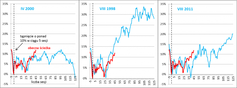 Na ostatnie wydarzenia na Wall Street, czyli dynamiczną poprawę sytuacji po wcześniejszym tąpnięciu, spoglądamy z pewną satysfakcją. Chłodne kalkulacje oparte na historycznych zależnościach pokazały swą wyższość nad emocjami. W najczarniejszych chwilach sierpniowego załamania zestawiliśmy krach (10% spadku S&P 500 w ciągu pięciu sesji) z podobnymi siedmioma historycznymi przypadkami i wniosek był taki, że w niemal wszystkich tych przypadkach po takich tąpnięciach nadchodziła przynajmniej średnioterminowa poprawa koniunktury (chwilowo przerwana przez ponowne zejście w kierunku dołka). Do podobnych wniosków prowadziła analiza rozmaitych wskaźników nastrojów ("sentymentu"), które zgodnie pokazały załamanie niezłomnej wcześniej wiary w hossę. Potem, pod koniec września spośród początkowych siedmiu przypadków wyłoniliśmy metodą selekcji trzy, które okazały się najbardziej zbliżone do aktualnego zachowania S&P 500. Wynikało z nich jasno, że trwający wtedy powrót do dołka (wtórna fala spadkowa) powinien być tylko chwilowym testem cierpliwości inwestorów przed trwalszą poprawą - dziś widać, że teza okazała się słuszna. Co ciekawe po miesiącu od wrześniowej analizy S&P 500 podąża ścieżką niemal idealnie zgodną ze średnią obliczoną na podstawie wspomnianych trzech historycznych przypadków.