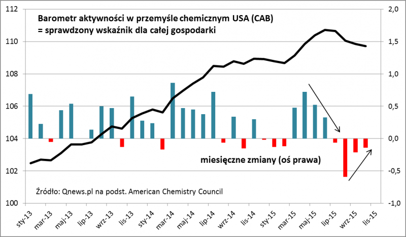 W badaniu historycznych analogii jest jeszcze jedna ciekawa kwestia. W jednym z trzech wspomnianych historycznych przypadków po ok. 100 sesjach od dołka krachu fala poprawy dobiegła końca i rozpoczął się kolejny etap bessy (chodzi o rok 2000). Innymi słowy badane przez nas scenariusze nie gwarantują jeszcze, że odbywające się obecnie średnioterminowe odreagowanie należy utożsamiać z definitywnym uniknięciem bessy. W czarnym scenariuszu, po ok. 100 sesjach od sierpniowego dołka, czyli w okolicach stycznia 2016, należałoby zatem bać się końca odreagowania. Pesymiści mają w zanadrzu pewne argumenty przemawiające za taką wizją, a wśród nich są dostrzegalne oznaki zadyszki w globalnej i amerykańskiej gospodarce. Dostrzegamy je także i my. Przykładowo monitorowany przez nas, sprawdzony historycznie "barometr aktywności w przemyśle chemicznym" (CAB), według najnowszego odczytu ma za sobą czwarty miesiąc spadku. To pierwszy tego rodzaju przypadek od ponad trzech lat. Na szczęście jednak dynamika tego spadku stopniowo słabnie. Najmocniej CAB zanurkował w sierpniu (sierpniowe tąpnięcie to zatem nie przypadek), zaś w październiku zniżka była już niewielka.