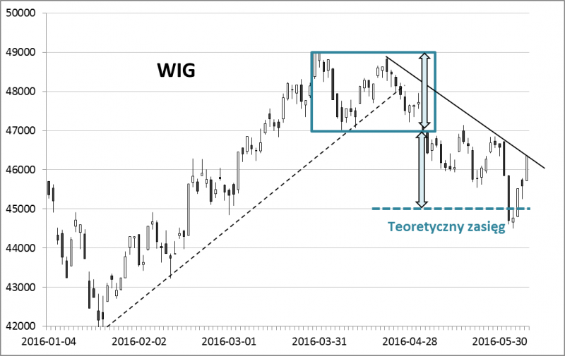 Czysto techniczne, chłodno skalkulowane spojrzenie na wydarzenia rynkowe może popłacać. Mamy tego najnowszy przykład. Niemal dokładnie miesiąc temu staraliśmy się oszacować potencjalny zasięg korekty spadkowej na GPW, za podstawę biorąc szerokość konsolidacji (trendu bocznego), w jakiej WIG tkwił przez cały kwiecień. Wniosek był taki, że indeks może dotrzeć w okolicę 45.000 pkt.