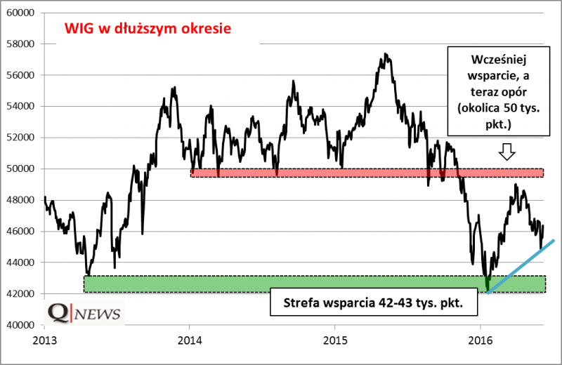 Gdyby okazało się, że korekta spadkowa już za nami, to jej dołek byłby położony wyraźnie powyżej tego styczniowego. A to pozwoliłoby narysować linię trendu wzrostowego. Być może zatem sytuacja przechodzi stopniową ewolucję w pozytywnym kierunku? Przekreśleniem tego scenariusza byłby ponowny spadek WIG poniżej wspomnianej linii (obecnie ok. 45.000 pkt.).