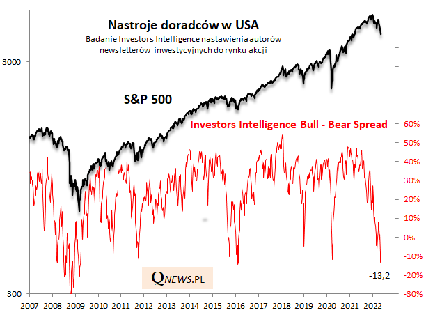 Silne schłodzenie "sentymentu" widać również na Wall Street. Naszą uwagę zwraca szanowane badanie nastawienia "doradców" firmy Investors Intelligence, w którym odsetek optymistów w tym tygodniu stał się o 13,2 pkt. proc. niższy od odsetka pesymistów. To poziom wskaźnika niższy nawet niż ten odnotowany w trakcie covidowego krachu w marcu 2020. Poprzednio tak niski odczyt odnotowano jeszcze w lutym 2016.