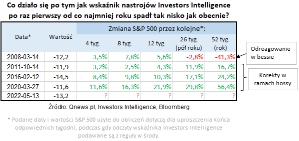 Jeśli przyjmiemy ostrożnościowo założenie, że tegoroczna wyprzedaż na Wall Street stanowi początek czegoś większego niż kilka poprzednich, dość krótkotrwałych ruchów spadkowych, to widać, że nawet w trakcie wielkiej bessy w 2008 roku spadek omawianego wskaźnika Investors Intelligence do zbliżonego co obecnie poziomu był sygnałem do odreagowania (po tym odreagowaniu rynek akcji podążył znów w dół, a wskaźnik nastrojów zszedł na jeszcze niższe poziomy).