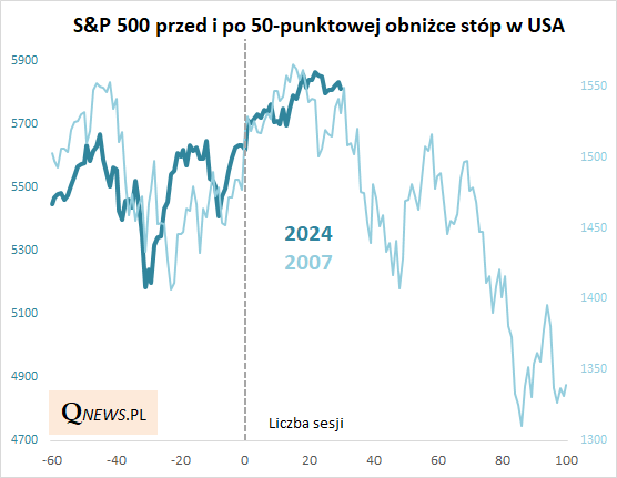 W pierwszym rzędzie nasuwa się niezmiennie opisywana już przez nas wcześniej analogia do 2007 roku. Dlaczego? Bo to właśnie wtedy miało miejsce równie huczne otwarcie cyklu obniżek stóp. Na tym nie koniec, bo cykl ten rozpoczął się z niemal identycznego poziomu, co wtedy. Najwyższego od lat, przekraczającego 5 proc. I co jeszcze ciekawsze, pierwsza obniżka nadeszła po niemal tak samo długim jak wtedy okresie utrzymywania kosztów pieniądza na wysokim pułapie. A jakby tego było jeszcze mało, Fed wykonał „jumbo cut” dokładnie w tym samym miesiącu i nawet w tym samym dniu (!), co w 2007 roku.