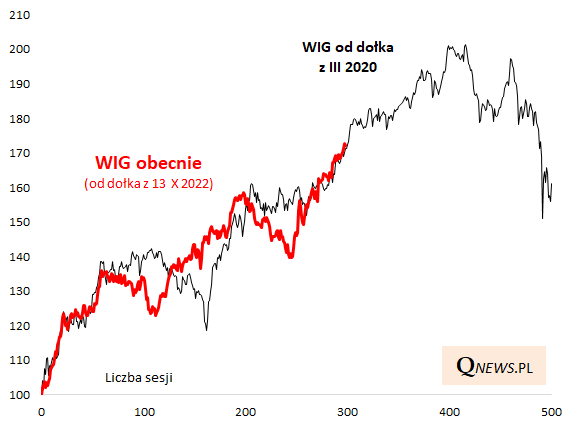 Niesamowite, jak bardzo obecne zachowanie WIG jest podobne do tego z okresu po covidowym krachu, mimo ewidentnych różnic, jeśli chodzi o kontekst makroekonomiczny (wtedy ogromna stymulacja fiskalno-monetarna na świecie, teraz normalizacja inflacji)! Dobra wiadomość jest taka, że gdyby nadal trzymać się tej intrygującej analogii, to istnieje jeszcze ciągle potencjał wzrostowy - ok. 17 proc. Realizacja takiego scenariusza pozwoliłaby krajowemu benchmarkowi przekroczyć pułap 90 tys. pkt., a szczyt przed kolejną bessą ukształtowałby się za ok. 100 sesji, czyli w okolicy maja.