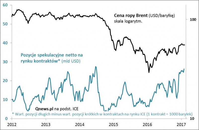 Czy ktoś pamięta jeszcze, że rok temu notowania ropy naftowej w atmosferze paniki ustanawiały dno bessy? Za baryłkę ropy gatunku Brent trzeba było zapłacić mniej niż 30 USD. Teraz jest to ok. 55 USD - ponad 80% więcej. W tym czasie sporo zmieniło się, jeśli chodzi o "fundamenty" ekonomiczne. OPEC osiągnął porozumienie w sprawie redukcji wydobycia, a Międzynarodowa Agencja Energii (IEA) prognozuje szybsze zniknięcie nadwyżki surowca na globalnych rynkach. Jeszcze bardziej, niż czynniki fundamentalne zmieniło się jednak postrzeganie sytuacji przez aktywnych traderów. Doskonale świadczą o tym monitorowane przez nas dane nt. wielkości pozycji spekulacyjnych na rynku kontraktów terminowych (futures) ICE.