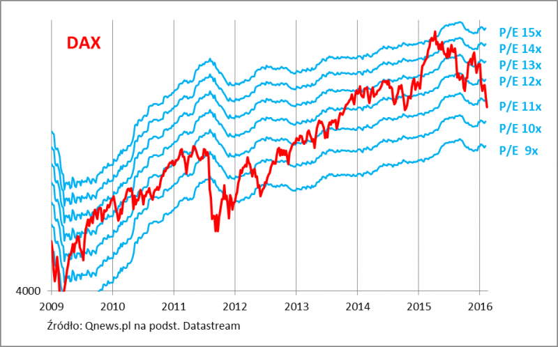 Przykładowo wskaźnik ceny do prognozowanych zysków niemieckich spółek w ciągu dziesięciu miesięcy przebył długą drogę z poziomów rzędu 15x do ok. 10,5x. Rok temu chyba mało kto wyobrażał sobie taki scenariusz (przed rokiem panowały zgoła odmienne nastroje - liczono na ożywienie w strefie euro i "cudowne" efekty europejskiego QE).