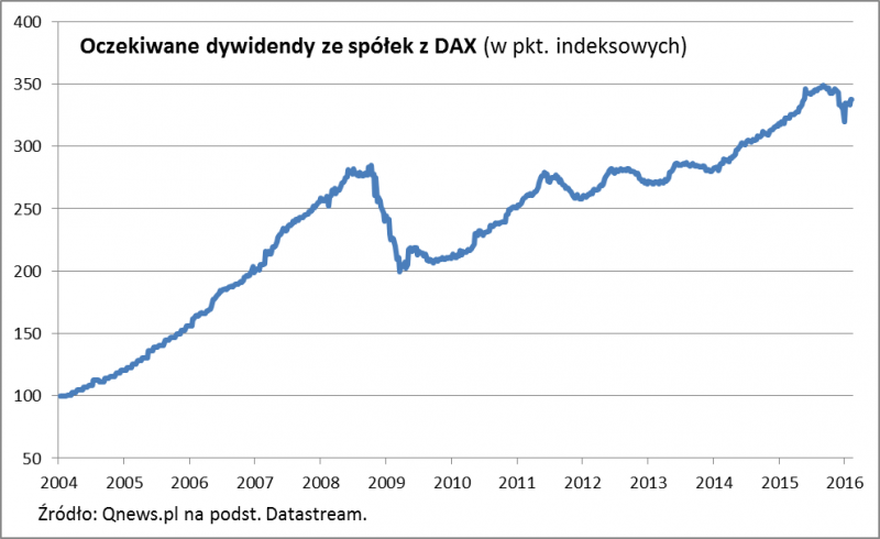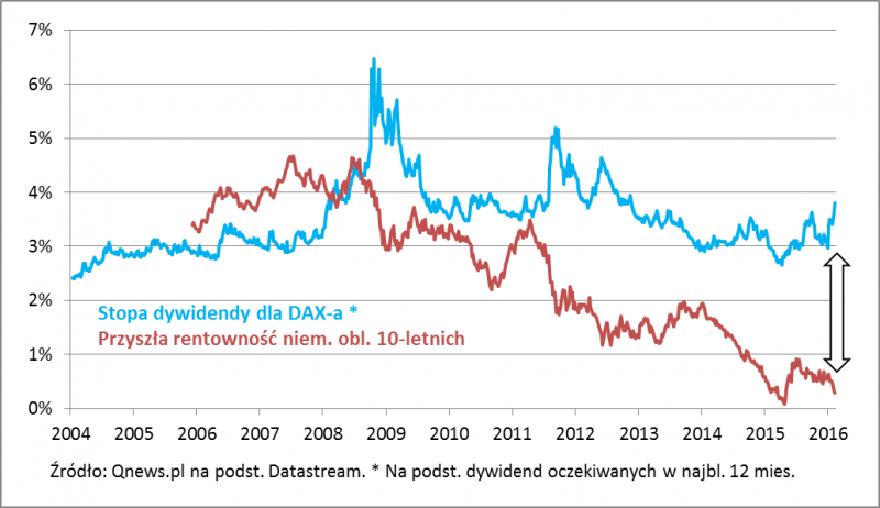 Być może jeszcze bardziej obrazowym wskaźnikiem jest (oczekiwana) stopa dywidendy, która w przypadku DAX-a zbliża się do 4%. Nie jest to jeszcze poziom wysoki nominalnie (w trakcie bessy w 2008 r. stopa dywidendy została wywindowana powyżej bardzo atrakcyjnego pułapu 6%). Jest jednak wysoki w porównaniu ze wspomnianą rentownością obligacji, która pod wpływem m.in. QE szoruje po dnie.