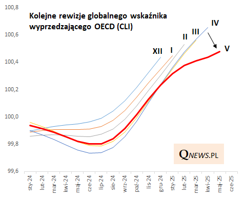 Ponownie zaskakuje też obserwowany przez nas globalny wskaźnik wyprzedzający OECD (tzw. CLI). Podczas gdy jeszcze poprzedni odczyt (z maja) sygnalizował dalszą stabilną poprawę, to najnowszy odczyt przyniósł negatywne zaskoczenie - wyraźnie w dół zostały zrewidowane dane za poprzednie kilka miesięcy, a najnowsza wartość jest wyraźnie poniżej tej sprzed miesiąca (100,48 wobec 100,65 - jak na CLI to spora zmiana).