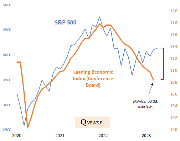 Dlaczego tempo odreagowania jest tak rachityczne? Przyczyn, obok np. restrykcyjnej polityki monetarnej, szukać można np. w zachowaniu indeksu wyprzedzającego (LEI) Conference Board. "Pełzające" odreagowanie S&P 500 można i tak uznać za nie lada wyczyn, biorąc pod uwagę, że w tym samym czasie LEI bez zmrużenia oka kontynuuje trend spadkowy. Wg podanego właśnie najnowszego odczytu, wskaźnik w marcu nawet przyspieszył zniżkę i znalazł się najniżej od 28 miesięcy. Powiększa się bezprecedensowa luka między zachowaniem S&P 500 i LEI. Na ogół bowiem poruszają się one w tym samym kierunku.