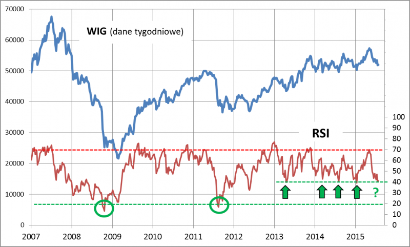 Widoczny w dolnej części wykresu popularny wskaźnik RSI (w wersji opartej na danych tygodniowych - to ważne) pozwala dostrzec kilka istotnych kwestii na temat obecnego położenia rynku akcji. Na skutek ostatniej korekty spadkowej RSI, będący wskaźnikiem przegrzania/schłodzenia koniunktury, zawędrował do poziomu ok. 40 pkt. - dokładnie na tym pułapie zatrzymywały się wszystkie najgłębsze fale spadkowe ostatnich trzech lat. Jeśli ta analogia się utrzyma, to mamy obecnie dobry moment na kupowanie akcji na GPW.
