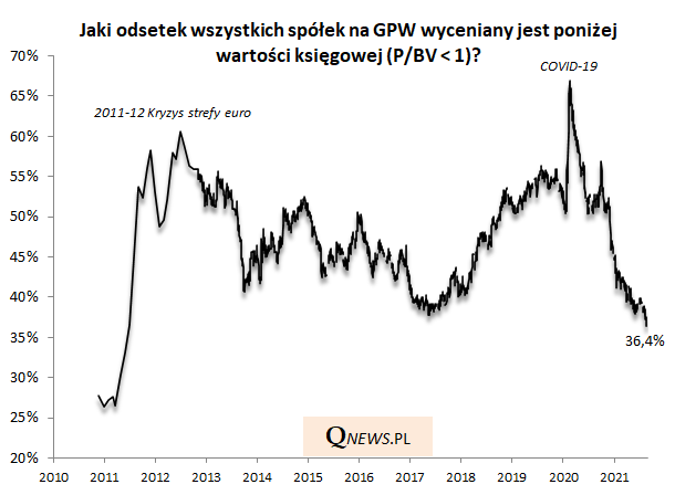 W okresach kryzysowych, gdy przez rynek przechodzi fala paniki, odsetek nisko wycenionych firm potrafił podskoczyć powyżej 60% (tąpnięcie w 2011 roku), a nawet blisko 70% (COVID-19). Tak wysokie odczyty okazywały się nie lada okazjami do zakupów.